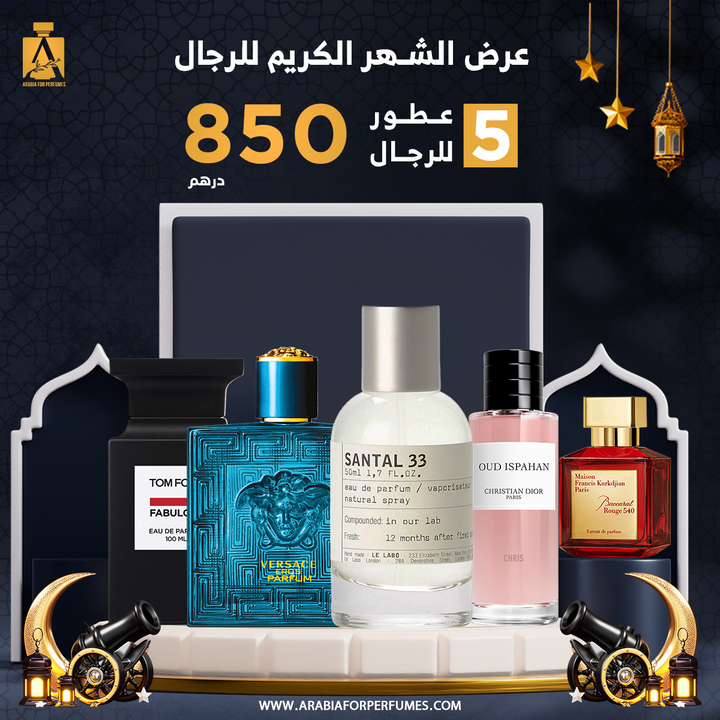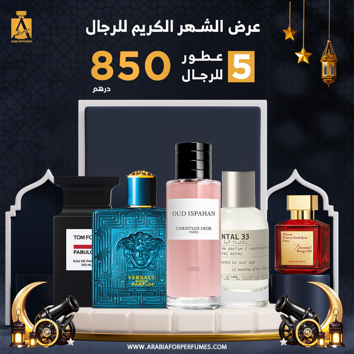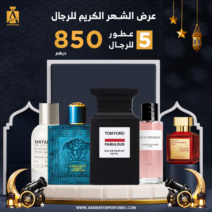 عرض شهر رمضان للرجال من العربية للعطور بمناسبة شهر رمضان المبارك 5 عطور من أرقى العطور العالمية للرجال بخصم يصل إلى 70% العرض مكون من 5 عطور هم Versace Eros 100 ml Le Labo 100 ml Maison Francis Kurkdjian 70 ml Tom Ford Fabulous 100 ml Oud Ispahan - Christian Dior 125 ml أطلب العرض الآن واستفيد بالشحن المجاني لجميع انحاء الامارات